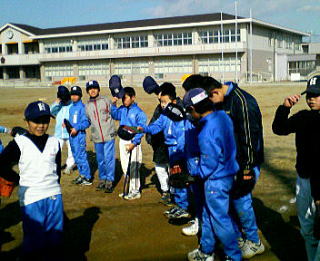 ■2週続けての外での練習■(2007/1/28) 先週に引き続き冬なのにグランドでの練習。 久しぶりに試合形式での守備練習をしました。 5年生以下は何点取られるか? 佐藤周、鈴木吉栄、佐藤史弥が投手。 みんな初めての投手ですが、 佐藤史弥がコントロール良く、 守備でのリズムが良かったですね。 でも、守備はまだまだ。 毎回5点位は入ってました。 紅白戦は7回まで。 先週と違い慣れてきたのか元気いっぱいでした。 良い当たりもいっぱいありましたね。 中村和磨(4年)菊池翔(6年)西村英人(4年) 小嶋賢治(6年)などがナイスバッティング。 守備でもあちこちでナイスプレーがありました。 でも、細かなところはこれからです。 基本的なプレーをみっちりしないと、 細かいところはできませんね。 |